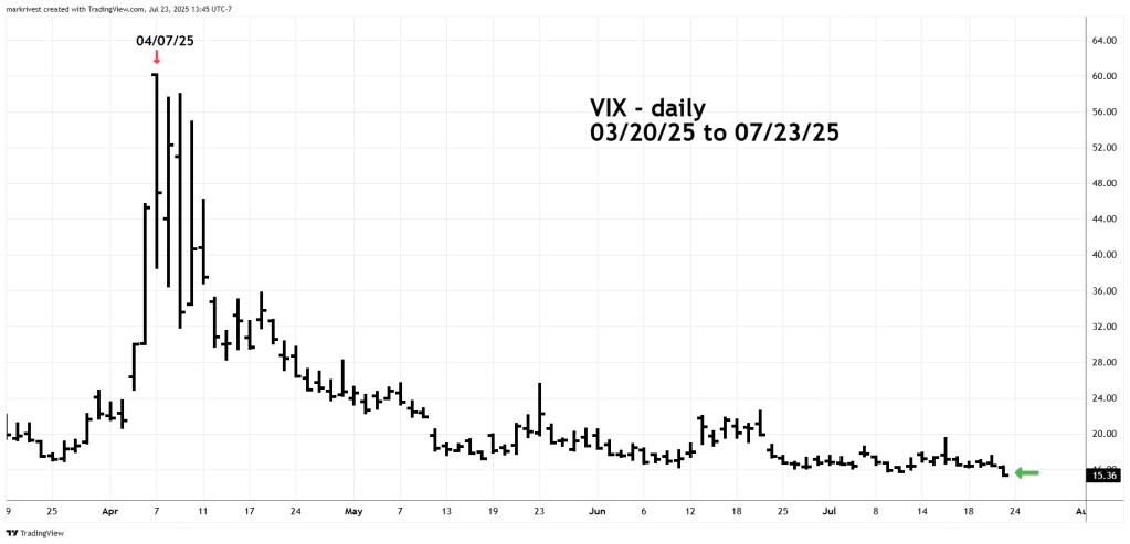 The 07/18/25 blog “U.S. Stock Bulls on Thin Ice – 07/18/25” noted that the VIX made a higher daily low vs. the S&P 500 (SPX) new all-time high – a bearish factor. Also noted an additional bearish factor would be only one of the three main U.S. stock indices, SPX, Dow Jones Industrial Average, and Nasdaq Composite making a new all-time high.