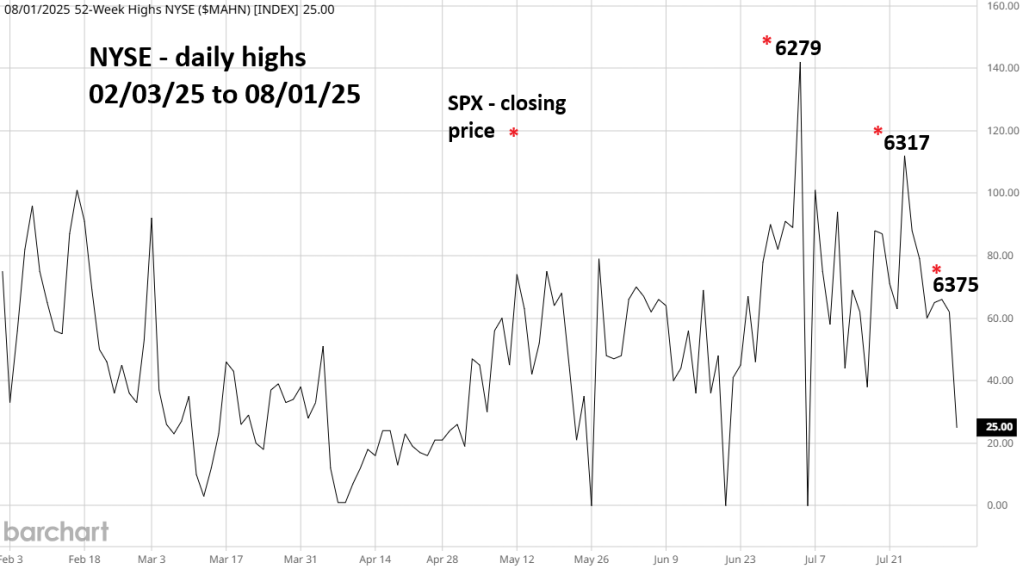 Since the SPX peak on 07/03/25 the number of new NYSE – 52 – week highs have been collapsing.