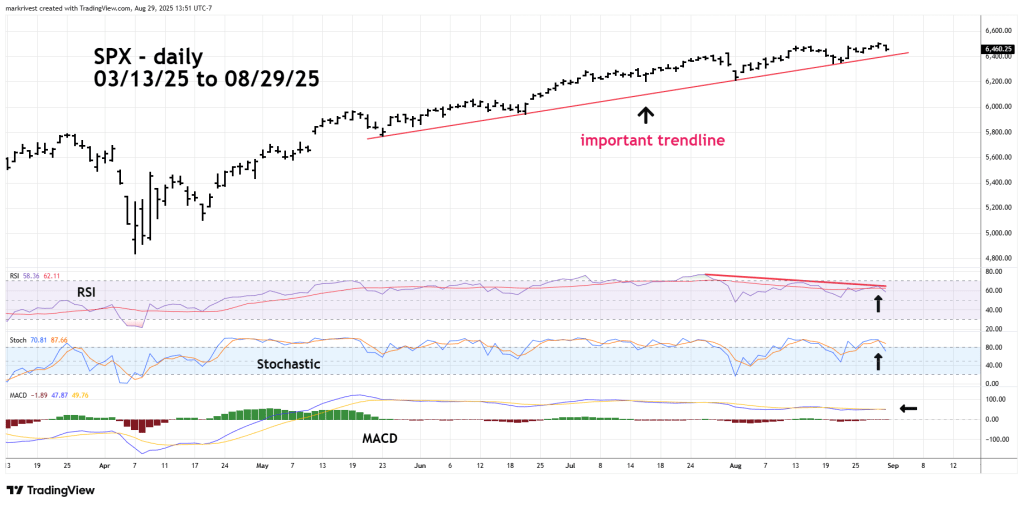 On 08/27/25 and 08/28/25 the S&P 500 (SPX) made all-time highs unconfirmed by the other two main U.S. stock indices: Dow Jones Industrial Average and Nasdaq Composite. This is a major bearish momentum divergence. However, on 08/28/25, VIX made a new post 04/07/25 bottom. All the major SPX peaks since March 2000 have occurred with VIX at a higher bottom.