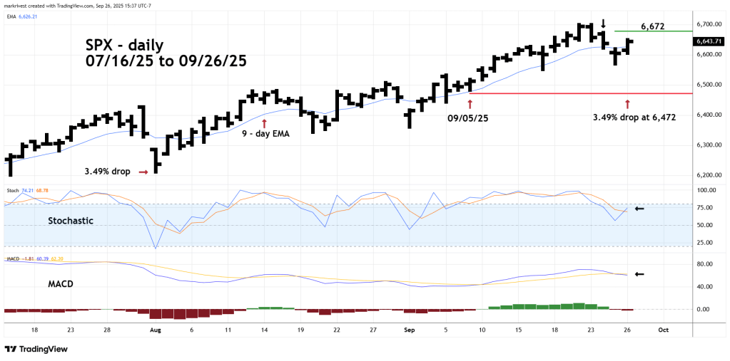The 9 – day Exponential Moving Average (EMA) could be the deciding factor. On 09/26/25 the SPX moved and closed above the 9 – day EMA line.