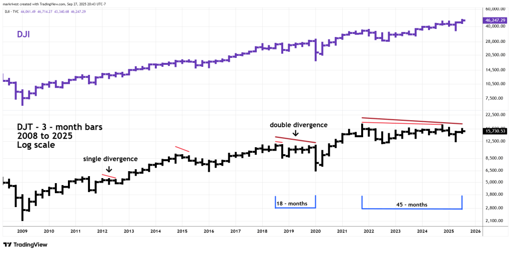 The Trading View DJT and DJI chart using 3 – month bars illustrate their relationship since the start of the secular bull market in March 2009.