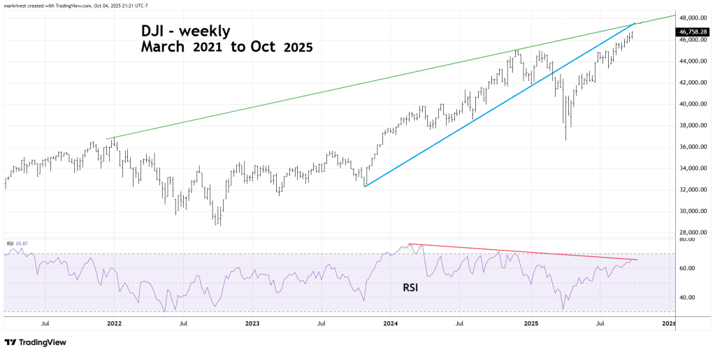 Sometimes prior support trendlines could become resistance. In this case the DJI is also close to the prior support trendline connecting the October 2023, August 2024, and January 2025 bottoms.