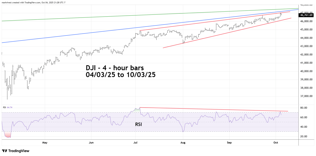 The DJI – 4 – hour bar chart zooms in on recent action.