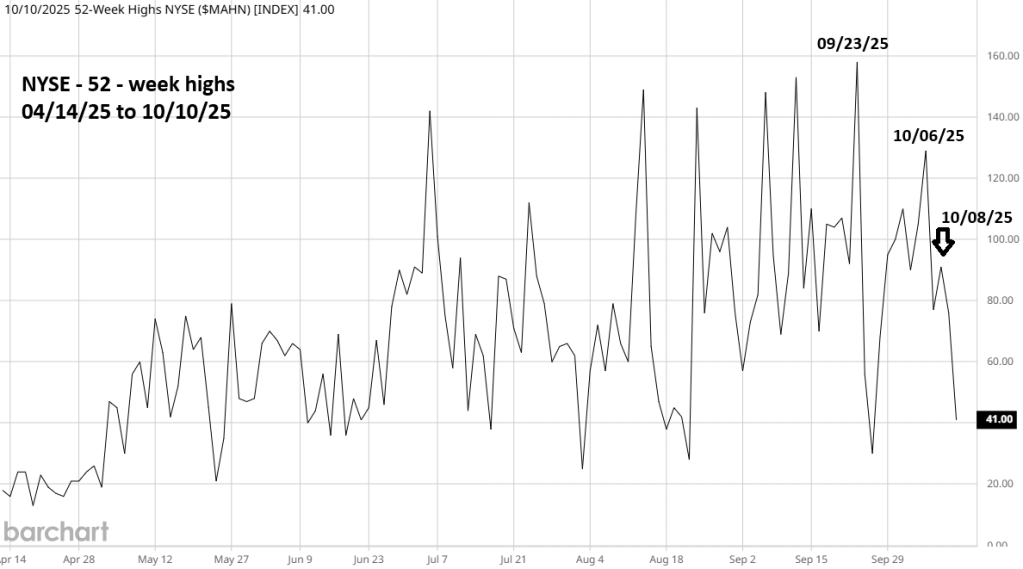 The daily NYSE – 52 – week highs chart courtesy of Barchart.com examines internal momentum since the April 2025 bottom.