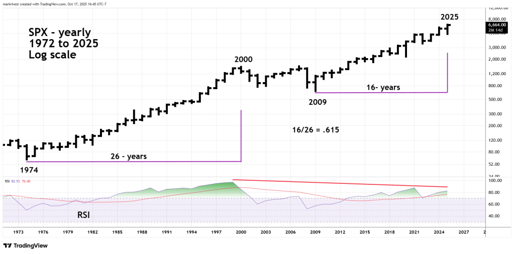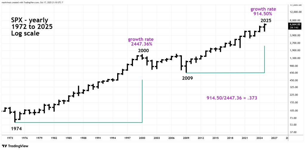 The 1974 to 2000 bull market had a growth rate of 2,447.36%. The growth rate of the 2009 to 2025 bull market is so far 914.50%. The ratio of 914.50 to 2,447.36 is .373 within leeway of the Fibonacci ratio of .382.