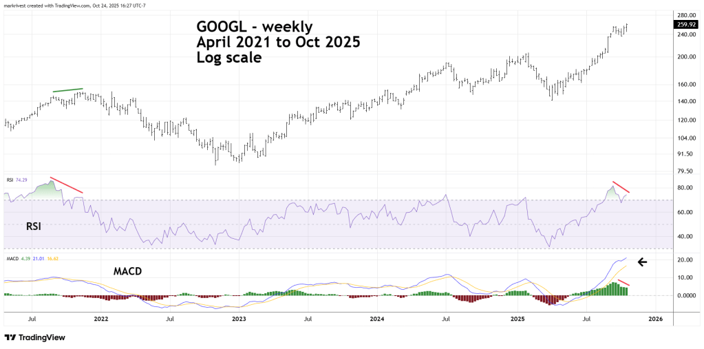 In the 09/07/25 blog GOOGL weekly RSI was at its peak since April 2025, now there’s a bearish divergence., along with the weekly MACD – Histogram. MACD – lines are still rising implying there’s fuel remaining for more upside action.