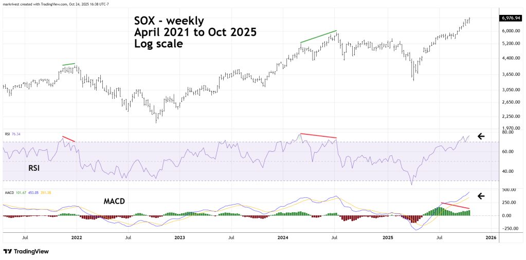 Weekly RSI continues to make new post April 2025 highs. Most of the time Stocks and stock indices will peak with at least one RSI bearish divergence. The current RSI reading implies SOX may not peak for several weeks.