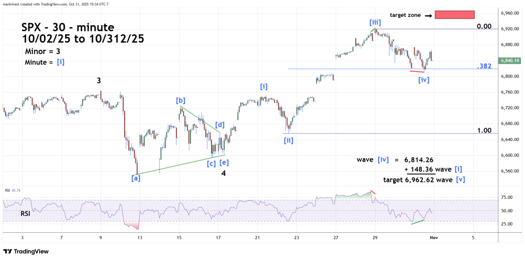The subsequent rally has the smooth look of an Elliott impulse wave. The next rally from 10/22/25 to 10/29/25 is longer than the presumed Minute wave [i]. Third sub waves in impulse patterns are usually the longest and most powerful. Retracement of third waves are usually shallow, and a Fibonacci .382 retracement is common. Also note that the presumed Minute wave [ii] and [iv] are close to equal which is a common Fibonacci relationship of impulse wave corrections.