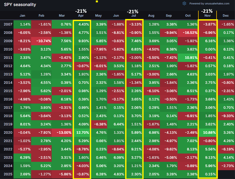 The graph spans from 2007 to 2025. Note that April, July, and November are the most bullish months. Only four out of the nineteen months was bearish, a ratio of 4/19 or 21%. The bullish percentage is 79%. This simple statistical analysis tells you that in November -trade on the bullish side.