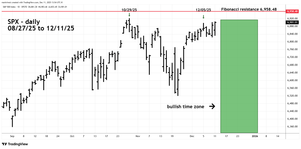 On 12/11/25 SPX ended its session at 6,901.01 and could soon exceed the 10/29/25 peak at 6,920.34. Above the all-time high is major Fibonccai resistance at 6,958.48 which was last noted in the 11/28/25 blog.