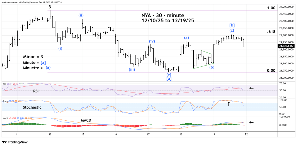 The prior two blogs illustrated that the S&P 500 was probably in Minute wave [c] of a developing Horizontal Triangle since the 10/29/25 peak. The NYA – Elliott wave count is different and may be forming only a Single Zigzag Correction after its 12/12/25 top.