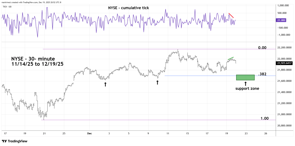 On 12/19/25 NYA was up from its prior day close. Normally on bullish NYA days the NYSE – cumulative tick is in the range of +700 to +1,000. The cumulative tick high on 12/19/25 was only +470. After the tick high, NYA continued to rise while cumulative ticks declined.
