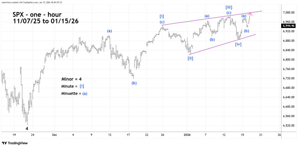 The 01/08/26 blog “Upside Target Reached – 01/08/26” illustrated that the S&P 500 (SPX) could be forming an Elliott wave – Ending Diagonal Triangle. This pattern is still the highest probable wave count, however with a change of the internal wave structure.