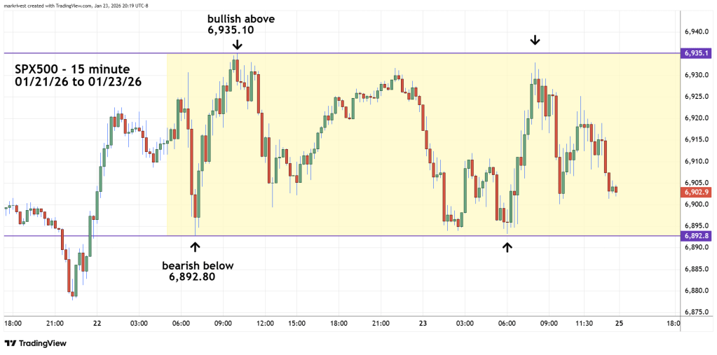 From 01/22/26 to 01/23/26 a sideways channel formed. A move above the double top near 6,935.10 is bullish. A move below the double bottom near 6,892.80 is bearish.