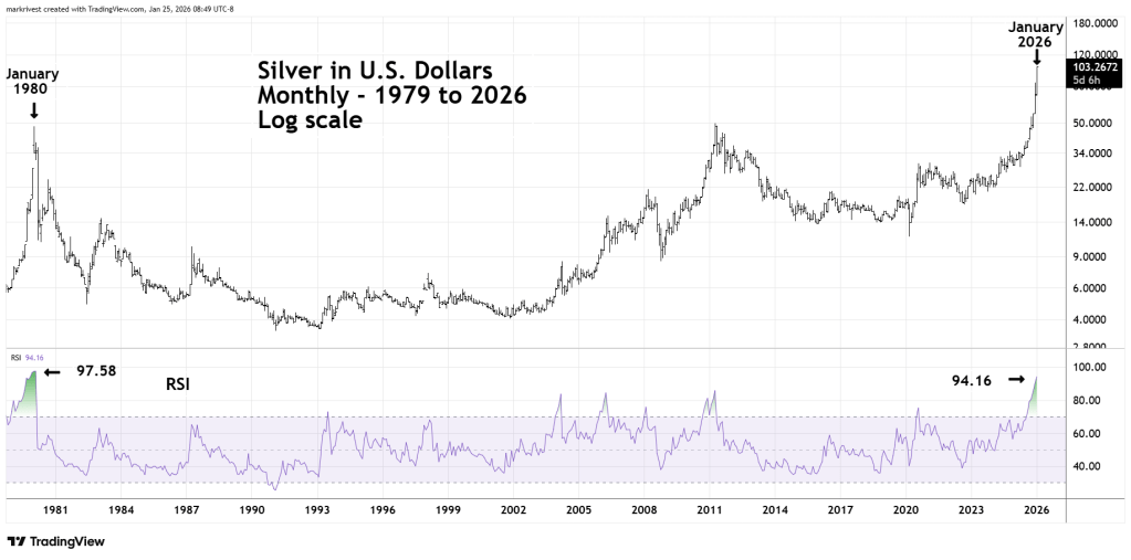 “If Silver continues to climb, could it move up 203% from the late October 2025 bottom? Siver closed the week of 12/26/25 at 79.32. If it can match the ten – week post November 1979 rally it would bring Silver to around 137.00 sometime in early January 2026. The low end of a potential topping zone could be in the low 100.00 area”.
