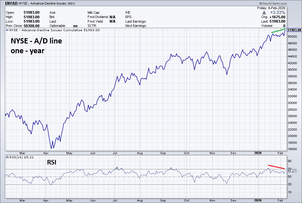 First an update on internal U.S. stock market momentum. The prior blog “February Downside Rollover – 02/05/26” noted that both the NYSE and S&P 500 – Advance/Decline lines made new all-time highs. On 02/06/26 both these indicators again made new highs.