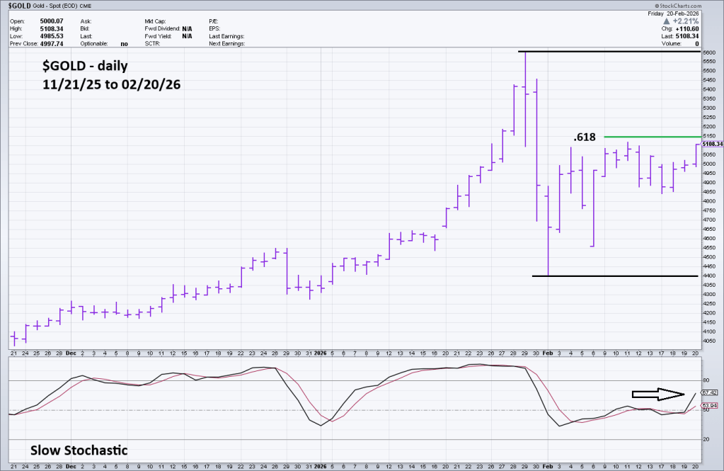 The daily spot Gold ($GOLD) chart courtesy of StockCharts.com illustrates the action since November 2025.