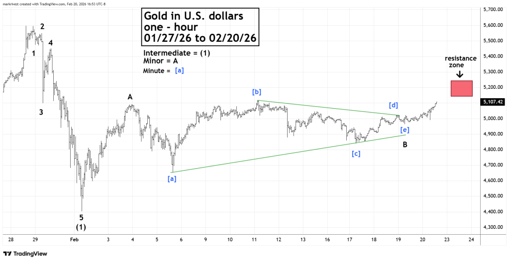 The hourly Gold in U.S. dollars chart courtesy of Trading view shows a possible Elliott wave count after the late January peak.