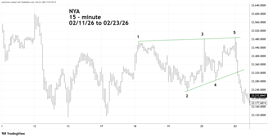 On 02/23/26 shortly after 9:30 – AM – EDT – NYA moved about a point above the rising trendline then had a sharp decline. There’s a high probability the Ending Diagonal Triangle from the 02/13/26 bottom is complete.