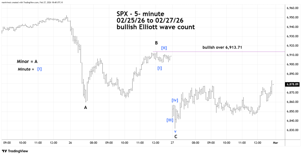 If so the first bearish trigger point is a move below the presumed Minuette wave “(b)’” low at 6,845.61. This break could bring the SPX down to the presumed Minuette wave “[ i ]’’ bottom at 6,831.74.