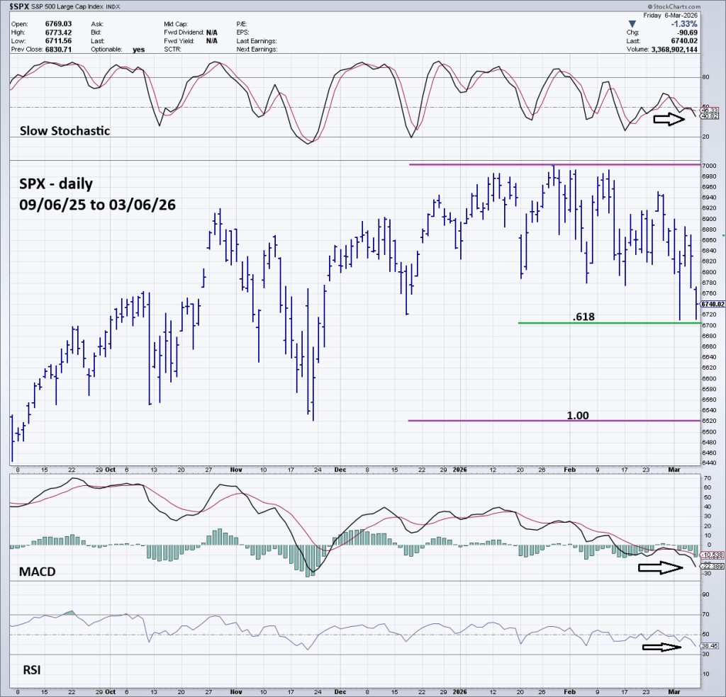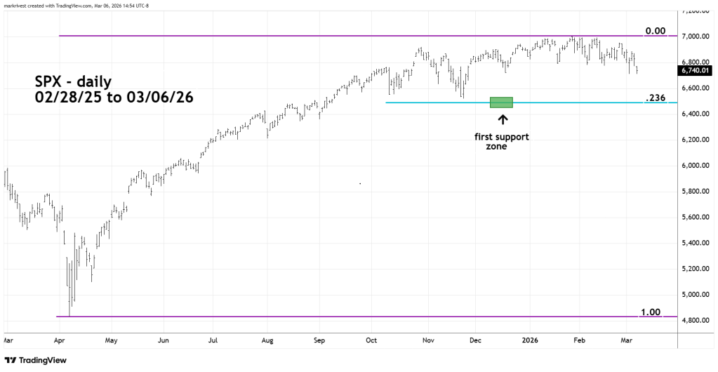 Caution, if the SPX makes a bottom in this zone, it may only be a pause in a larger developing decline. So far, the largest correction of the post April 2025 rally has been 5% – this was the November 2025 decline. A decline from January 2026 peak to the 6,550 to 6,470 area would be about 6% to 7%.