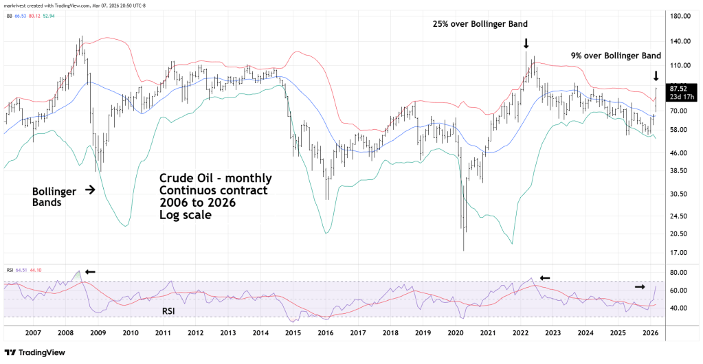 During early 2022 price went 25% above the upper Bollinger Band. Currently Crude Oil is only 9% above the upper Bollinger Band.