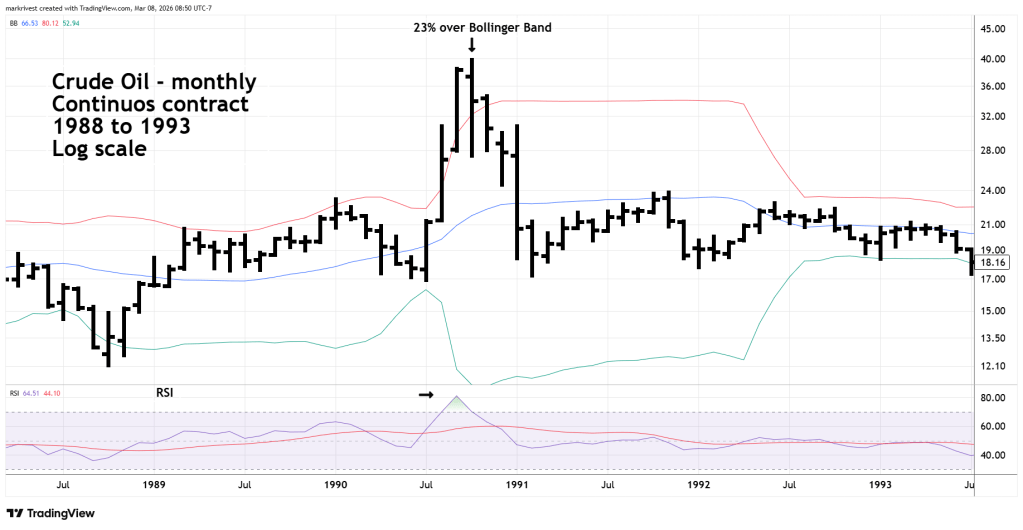 The next monthly Crude Oil chart shows what happened in 1990 when Sadam Hussein invaded Kuwait.