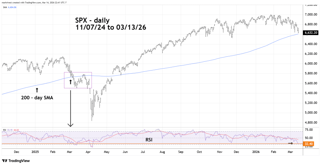 Please note that the last time the SPX was approaching the 200 – day SMA was in early March 2025. The daily RSI reading on 03/13/26 was 33.15. the daily RSI reading on 03/04/25 when the SPX was just above 200 – day SMA was 33.22.