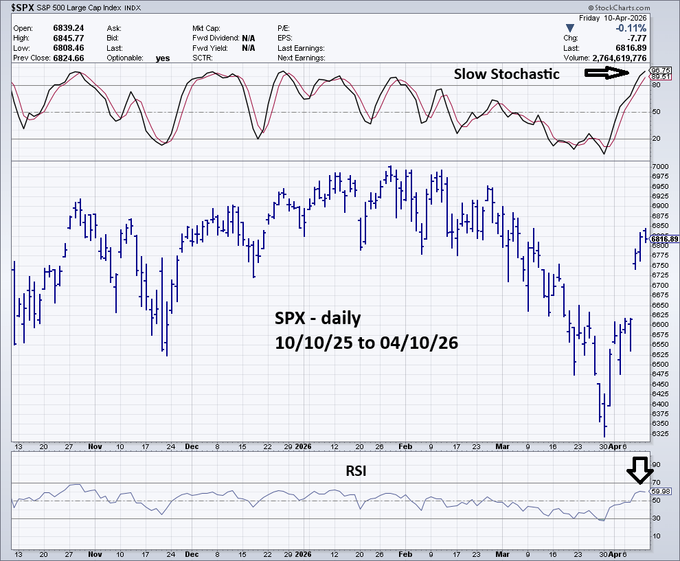 Daily RSI on 04/10/26 was 59, below the overbought zone of 70.00. An important price peak can form with the RSI below the overbought zone. The $SPX all-time high on 01/28/26 was made with a daily RSI reading of 58.00.