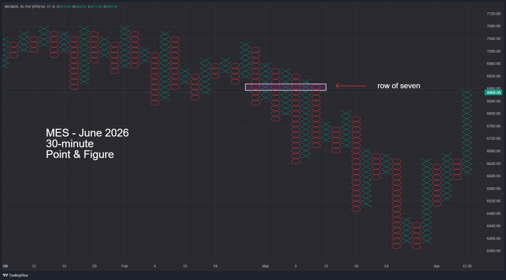 The 30 – minute June 2026 – Micro S&P 500 futures (MES) – Point & Figure chart courtesy of Trading View narrows the perspective.