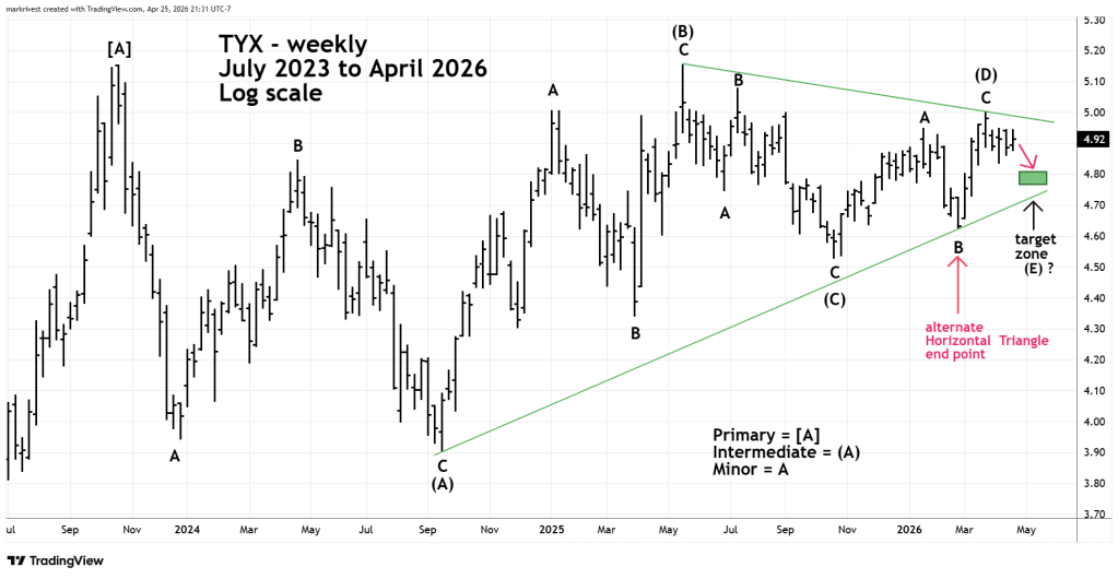 The 03/22/26 blog “The Case for Higher U.S. Interest Rates – March 2026” illustrated that the CBOE 30 – Year Treasury Bond Yield may have completed a multiyear Elliott wave – Horizontal Triangle at the 02/27/26 bottom. This wave count could be correct; however, there’s an alternate wave count in which the multiyear Horizontal Triangle is still in development.